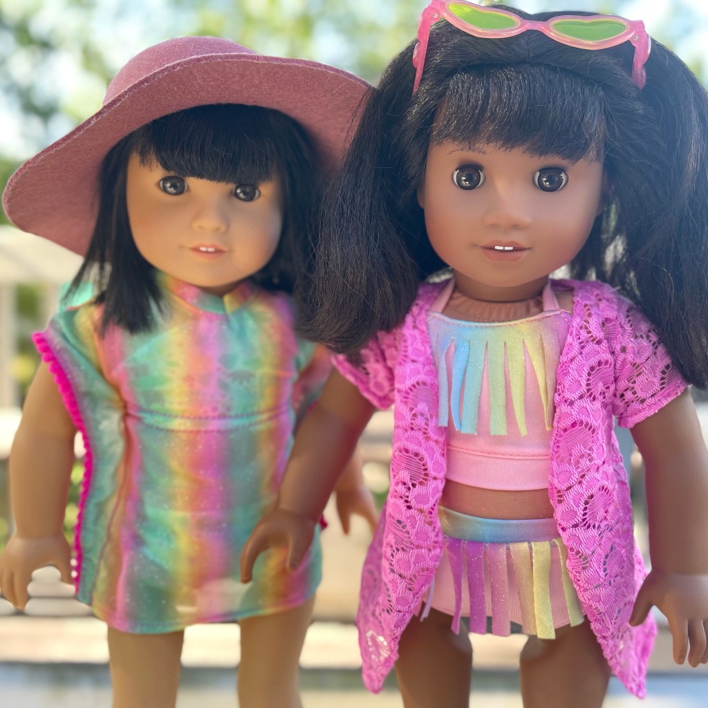 We ended up getting the fringe swimsuit and the tankini with rainbow coverup for $9.97 each. The quality is decent considering the brand and fit of the suits is good. The rainbow coverup fits, but is quite snug on our AG dolls. Here’s Ivy and Melody in their cute new swimsuits.