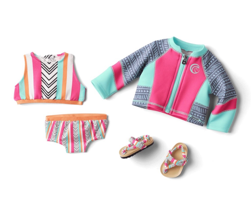 Joss’s Surf & Swim Set is also available separately for $28 and includes a 2 piece swim suit with a wetsuit top and sandals.